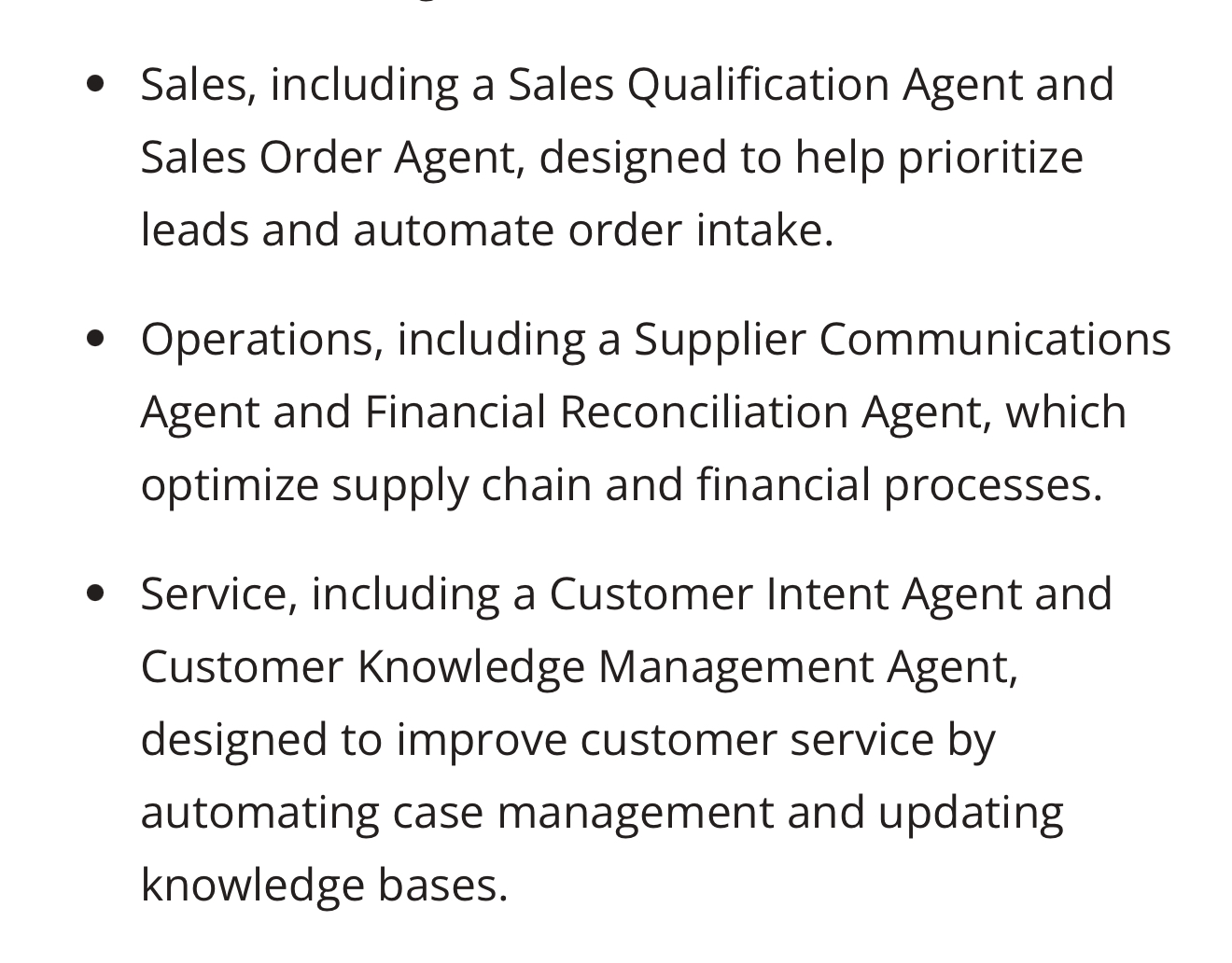 • Sales (Sales Order Agent, Sales Qualification Agent),
